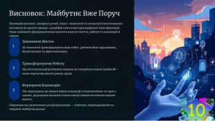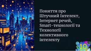 Урок спрямований на ознайомлення учнів із сучасними напрямами розвитку інформаційних технологій — штучним інтелектом (AI), Інтернетом речей (IoT), Smart-технологіями та технологіями колективного інтелекту. Учні дізнаються про принципи роботи цих систем, приклади їх використання у повсякденному житті, науці, освіті та промисловості.