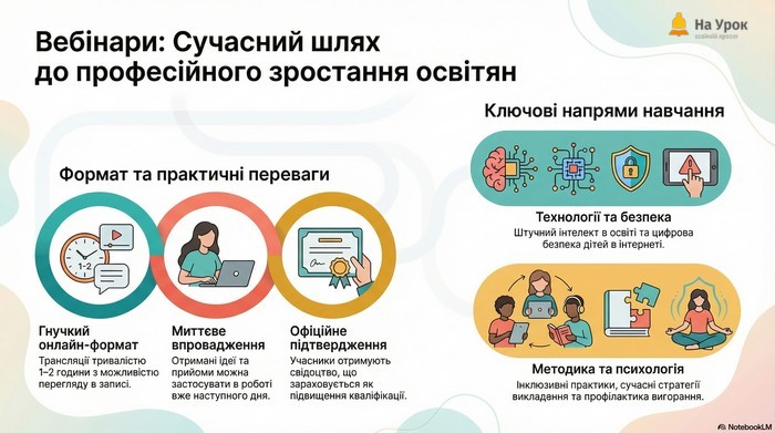 - Вебінари – дають можливість оперативно оновлювати знання, отримувати практичні інструменти та ідеї, які легко інтегрувати в освітній процес.