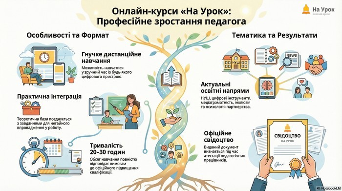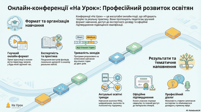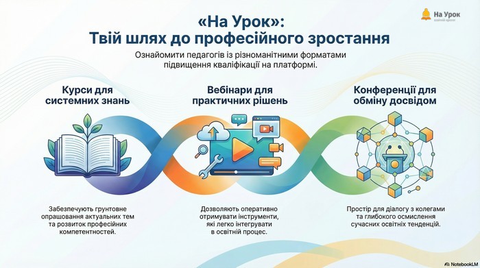 «На Урок» – це сучасна освітня платформа для безперервного професійного розвитку педагогів, яка поєднує ефективність, доступність і практичну спрямованість навчання. Вона пропонує різноманітні формати, що дозволяють кожному вчителю обрати оптимальний шлях підвищення кваліфікації: