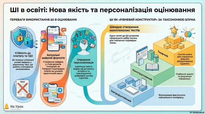 Для ефективного оцінювання за стандартами НУШ варто використовувати ШІ як «рівневий конструктор» за таксономією Блума. Ви можете одним запитом створити комплексний набір питань, де кожне наступне завдання поглиблює перевірку знань: