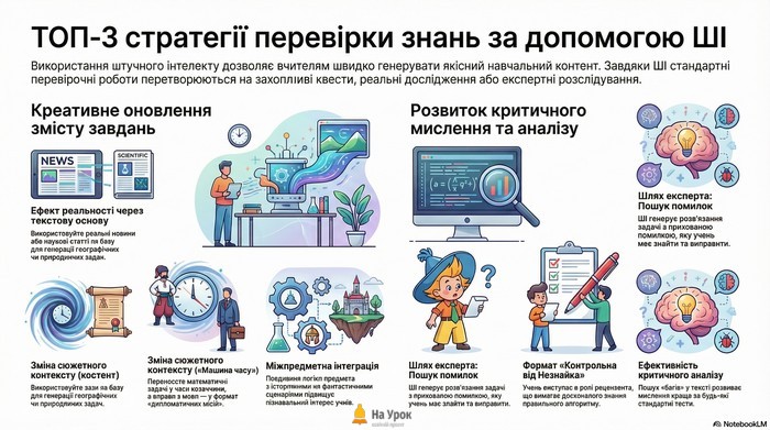 Найвищий рівень володіння матеріалом – це здатність помітити чужу помилку. Ви можете використати ШІ для створення формату «Контрольна від Незнайка». Попросіть нейромережу написати розв’язання складної задачі, у якому навмисно приховано одну логічну або обчислювальну помилку.
