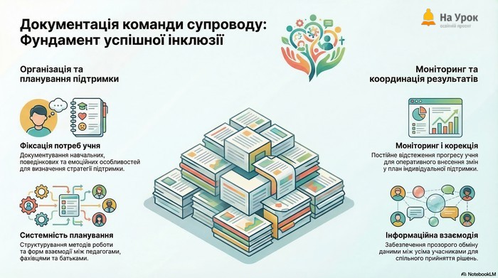 Ефективна робота команди супроводу у закладах загальної середньої освіти ґрунтується на системному підході до планування, організації та моніторингу підтримки учнів із ООП. Документація є ключовим інструментом, що забезпечує системність, прозорість та координацію дій усіх учасників освітнього процесу. Вона дозволяє не лише планувати підтримку, а й контролювати її реалізацію та оцінювати ефективність.