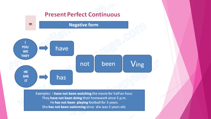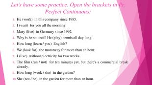 Let’s have some practice. Open the brackets in Pr. Perfect Continuous: He (work) in this company since 1985. I (wait) for you all the morning!Mary (live) in Germany since 1992. Why is he so tired? He (play) tennis all day long. How long (learn / you) English?We (look for) the motorway for more than an hour. I (live) without electricity for two weeks. The film (run / not) for ten minutes yet, but there's a commercial break already. How long (work / she) in the garden?She (not / be) in the garden for more than an hour.