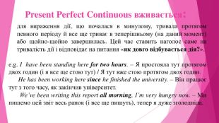 Present Perfect Continuous вживається:для вираження дії, що почалася в минулому, тривала протягом певного періоду й все ще триває в теперішньому (на даний момент) або щойно-щойно завершилась. Цей час ставить наголос саме на тривалість дії і відповідає на питання «як довго відбувається дія?».e.g. I have been standing here for two hours. – Я простояла тут протягом двох годин (і я все ще стою тут) / Я тут вже стою протягом двох годин. He has been working here since he finished the university. – Він працює тут з того часу, як закінчив університет. We’ve been writing this report all morning, I’m very hungry now. – Ми пишемо цей звіт весь ранок (і все ще пишуть), тепер я дуже зголодніла.
