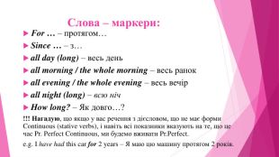 Слова – маркери: For … – протягом…Since … – з…all day (long) – весь деньall morning / the whole morning – весь ранокall evening / the whole evening – весь вечірall night (long) – всю ніч. How long? – Як довго…?!!! Нагадую, що якщо у вас речення з дієсловом, що не має форми Continuous (stative verbs), і навіть всі показники вказують на те, що це час Pr. Perfect Continuous, ми будемо вживати Pr. Perfect.e.g. I have had this car for 2 years – Я маю цю машину протягом 2 років.