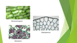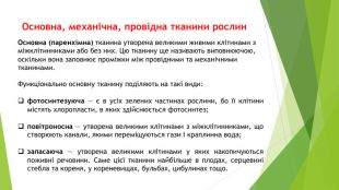 Основна, механічна, провідна тканини рослин. Основна (паренхімна) тканина утворена великими живими клітинами з міжклітинниками або без них. Цю тканину ще називають виповнюючою, оскільки вона заповнює проміжки між провідними та механічними тканинами. Функціонально основну тканину поділяють на такі види:фотосинтезуюча — є в усіх зелених частинах рослини, бо її клітини містять хлоропласти, в яких здійснюється фотосинтез;повітроносна — утворена великими клітинами з міжклітинниками, що створюють канали, якими переміщуються гази і краплинна вода;запасаюча — утворена великими клітинами у яких накопичуються поживні речовини. Саме цієї тканини найбільше в плодах, серцевині стебла та кореня, у кореневищах, бульбах, цибулинах тощо.