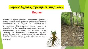Корінь: будова, функції та видозміни. Корінь. Корінь — орган рослини, основною функцією якого є закріплення рослини у місці зростання та забезпечення її водою та мінеральними речовинами. Характерною рисою кореня є наявність на його верхівці кореневого чохлика — спеціального утворення, що захищає твірну тканину від механічних пошкоджень під час росту під землею. Також корені, на відміну від пагонів, майже не утворюють бруньок на своїй поверхні.