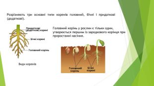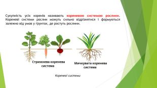 Стрижнева коренева система — з добре вираженим головним коренем і менш помітними бічними та додатковими. Така коренева система є у кульбаби, щавлю, моркви, буряків та ін. Мичкувата коренева система — без вираженого головного кореня, всі корені однакові за розміром. Головний корінь або рано відмирає, або є погано розвинутим. Мичкувата коренева система є у жита, кукурудзи, цибулі, подорожника та ін.