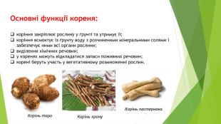 Основні функції кореня:коріння закріплює рослину у ґрунті та утримує її;коріння всмоктує із ґрунту воду з розчиненими мінеральними солями і забезпечує ними всі органи рослини;виділення хімічних речовин;у коренях можуть відкладатися запаси поживних речовин;корені беруть участь у вегетативному розмноженні рослин. Корінь таро. Корінь хрону. Корінь пастернака