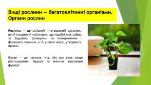 Вищі рослини — багатоклітинні організми. Органи рослин. Рослина — це цілісний інтегрований організм, який утворений клітинами, що подібні між собою за будовою, функціями та походженням і формують тканини, а ті, у свою чергу, утворюють органи. Орган — це частина тіла, він має своє місце розташування, будову та виконує відповідні функції.