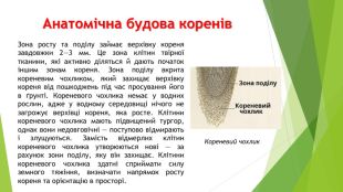 Анатомічна будова коренів. Зона росту та поділу займає верхівку кореня завдовжки 2—3 мм. Це зона клітин твірної тканини, які активно діляться й дають початок іншим зонам кореня. Зона поділу вкрита кореневим чохликом, який захищає верхівку кореня від пошкоджень під час просування його в ґрунті. Кореневого чохлика немає у водних рослин, адже у водному середовищі нічого не загрожує верхівці кореня, яка росте. Клітини кореневого чохлика мають підвищений тургор, однак вони недовговічні — поступово відмирають і злущуються. Замість відмерлих клітин кореневого чохлика утворюються нові — за рахунок зони поділу, яку він захищає. Клітини кореневого чохлика здатні сприймати силу земного тяжіння, визначати напрямок росту кореня та орієнтацію в просторі. Кореневий чохлик