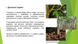 Дихальні кореніУ місцях зі стоячою водою або у місцях, які часто затоплюються є проблеми із забезпеченням кореневої системи киснем, оскільки кисень розчиняється у воді в обмеженій кількості. У мангрових рослин тропічних боліт, на основних коренях, які ростуть субстраті розвиваються дихальні корені, які ростуть вертикально вгору і піднімаються вище субстрату всупереч силі тяжіння Землі. Дихальні корені утворюються і у деяких дерев, що ростуть на заболоченому ґрунті. Болотяний кипарис