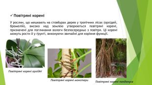 Повітряні кореніУ рослин, що мешкають на стовбурах дерев у тропічних лісах (орхідей, бромелій), високо над землею утворюються повітряні корені, призначені для поглинання вологи безпосередньо з повітря. Ці корені можуть рости й у ґрунті, виконуючи звичайні для коріння функції. Повітряні корені орхідеїПовітряні корені монстери. Повітряні корені пандануса