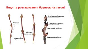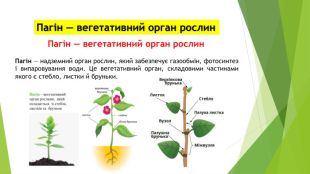 Стебло — видовжена осьова частина пагона, що слугує рослині механічною опорою. Листок — бічний плоский орган, що розміщений на стеблі й має обмежений ріст і пристосований до фотосинтезу. У їхніх клітинах багато хлоропластів, тому вони мають зелене забарвлення. Бруньки — це зачаткові пагони (квітки або суцвіття), у якому вже закладено всі частини майбутнього пагона, вони забезпечують тривале наростання й галуження, за рахунок чого формується пагонова система.