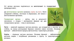 Отже, рослина — це цілісний інтегрований організм, утворений клітинами, що подібні між собою за будовою, функціями та походженням і формують тканини, а ті, у свою чергу, утворюють органи. У рослини є вегетативні (корінь і пагін — стебло, листки й бруньки) та генеративні (квітка, плід, насінина) органи. Є п’ять типів рослинних тканин: твірна, покривна, основна, механічна, провідна. Кожна з цих тканин відіграє важливу функцію для рослинного організму.