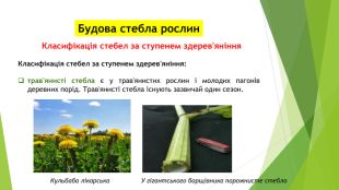 Будова стебла рослин. Класифікація стебел за ступенем здерев'яніння. Класифікація стебел за ступенем здерев'яніння: трав'янисті стебла є у трав'янистих рослин і молодих пагонів деревних порід. Трав'янисті стебла існують зазвичай один сезон. Кульбаба лікарська У гігантського борщівника порожнисте стебло