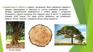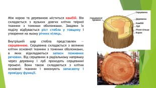 Будова стебла деревних рослин. Провідні тканини здійснюють переміщення води з розчиненими у ній поживними речовинами по стеблу рослини. Твірні тканини забезпечують утворення інших тканин та ріст стебла у товщину і висоту. Покривні тканини здійснюють зв'язок стебла із зовнішнім середовищем та захищають від несприятливих умов довкілля. Шари у зрізі дерева