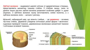 Луб'яні волокна — видовжені мертві клітини зі здерев'янілими стінками, представляють механічну тканину стебла. У стеблах льону, липи та деяких інших рослин луб'яні волокна розвинені особливо добре і є дуже міцними. З луб'яних волокон льону виготовляють лляне полотно, а з луб'яних волокон липи — мочало і рогожу. Щільний, найширший шар, що лежить глибше, — це деревина — основна частина стебла. Деревина утворена клітинами різної форми і величини: судинами провідної тканини, деревинними волокнами механічної тканини і клітинами основної тканини.