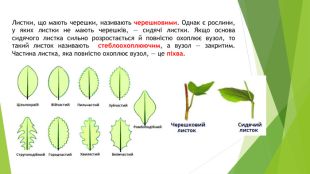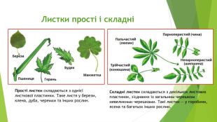 Листки прості і складніПрості листки складаються з однієї листкової пластинки. Таке листя у берези, клена, дуба, черемхи та інших рослин. Складні листки складаються з декількох листових пластинок, з'єднаних із загальним черешком невеликими черешками. Такі листки — у горобини, ясена та багатьох інших рослин.