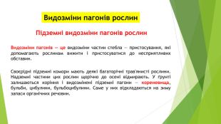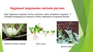 Видозміни пагонів рослин. Підземні видозміни пагонів рослин. Видозміни пагонів — це видозміни частин стебла — пристосування, які допомагають рослинам вижити і пристосуватися до несприятливих обставин. Своєрідні підземні комори мають деякі багаторічні трав'янисті рослини. Надземні частини цих рослин щорічно до осені відмирають. У ґрунті залишаються коріння і видозмінені підземні пагони — кореневища, бульби, цибулини, бульбоцибулини. Саме у них відкладаються на зиму запаси органічних речовин.
