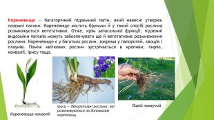 Кореневище — багаторічний підземний пагін, який навесні утворює наземні пагони. Кореневище містить бруньки й у такий спосіб рослина розмножується вегетативно. Отже, крім запасальної функції, підземні видозміни пагонів можуть забезпечувати ще й вегетативне розмноження рослини. Кореневище є у багатьох рослин, зокрема у папоротей, хвощів і плаунів. Поміж квіткових рослин зустрічається в кропиви, пирію, конвалії, ірису тощо. Кореневище конваліїІриси — декоративні рослини, які розмножуються за допомогою кореневищ. Пирій повзучий