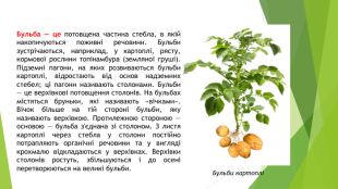 Бульба — це потовщена частина стебла, в якій накопичуються поживні речовини. Бульби зустрічаються, наприклад, у картоплі, рясту, кормової рослини топінамбура (земляної груші). Підземні пагони, на яких розвиваються бульби картоплі, відростають від основ надземних стебел; ці пагони називають столонами. Бульби — це верхівкові потовщення столонів. На бульбах містяться бруньки, які називають «вічками». Вічок більше на тій стороні бульби, яку називають верхівкою. Протилежною стороною — основою — бульба з'єднана зі столоном. З листя картоплі через стебла у столони постійно потрапляють органічні речовини та у вигляді крохмалю відкладаються у верхівках. Верхівки столонів ростуть, збільшуються і до осені перетворюються на великі бульби. Бульби картоплі