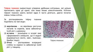 Твірна тканина (меристема) утворена дрібними клітинами, які щільно прилягають одна до одної, між ними немає міжклітинників. Клітини твірної тканини мають великі ядра й часто діляться, даючи початок новим типам клітин. Твірна тканина. За розташуванням твірну тканина поділяють на такі види:верхівкова — на верхівках ростучих пагонів та коренів, вона забезпечує їхній ріст у довжину;вставна — розміщена в основі вже сформованого міжвузля, що й надалі видовжується (жито, овес, пшениця, бамбук тощо);бічна — розташована всередині стебла чи кореня та забезпечує їхній ріст у товщину.
