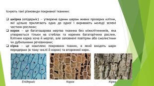Існують такі різновиди покривної тканини:шкірка (епідерміс) — утворена одним шаром живих прозорих клітин, які щільно прилягають одна до одної і вкривають молоді зелені частини рослини;корок — це багатошарова мертва тканина без міжклітинників, яка утворюється тільки на стеблах та коренях багаторічних рослин. Клітини корка хоча й мертві, але заповнені повітрям або смолистими чи дубильними речовинами;кірка — це комплекс покривних тканин, в який входять шари перидерми (в тому числі й корок) та вторинної кори. Епідерміс. Корок. Кірка