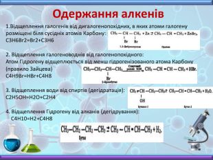 Одержання алкенів Відщеплення галогенів від дигалогенопохідних, в яких атоми галогену розміщені біля сусідніх атомів Карбону: C3 H6 Br2=Br2+C3 H62. Відщеплення галогеноводнів від галогенопохідного: Атом Гідрогену відщеплюється від менш гідрогенізованого атома Карбону (правило Зайцева) C4 H9 Br=HBr+C4 H83. Відщеплення води від спиртів (дегідратація): C2 H5 OH=H2 O+C2 H44. Відщеплення Гідрогену від алканів (дегідрування): C4 H10=H2+C4 H8