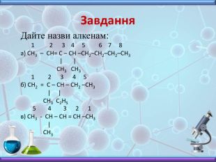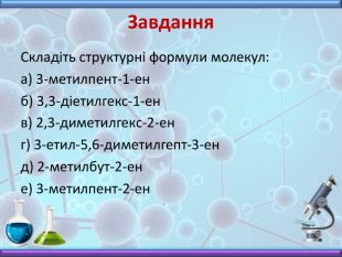 Презентація з хімії до вивчення теми "Алкени" у 10 класі. Містить інформацію про будову, номенклатуру, фізичні властивості, хімічні взаємодії та застосування алкенів. Включає завдання до цієї теми, необхідні для закріплення матеріалу.