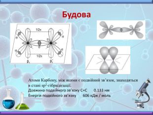 Будова Атоми Карбону, між якими є подвійний зв’язок, знаходяться в стані sp2-гібридизації. Довжина подвійного зв’язку С=С 0.133 нм. Енергія подвійного зв’язку 606 к. Дж / моль
