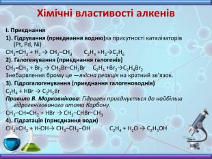 Хімічні властивості алкенів I. Приєднання1). Гідрування (приєднання водню)за присутності каталізаторів (Pt, Pd, Ni)CH2=CH2 + H2 → CH3–CH3 С2 Н4 +Н2→С2 Н62). Галогенування (приєднання галогенів)CH2=CH2 + Br2 → CH2 Br–CH2 Br С2 Н4 +Br2→С2 Н4 Br2 Знебарвлення брому це —якісна реакція на кратний зв’язок.3). Гідрогалогенування (приєднання галогеноводнів)C2 H4 + HBr → C2 H5 Br. Правило В. Марковнікова: Гідроген приєднується до найбільш гідрогенізованого атома Карбону. CH3–CH=CH2 + HBr → CH3–CHBr–CH34). Гідратація (приєднання води)CH2=CH2 + H-OН→ CH3–CH2–OH C2 H4 + H2 O → C2 H5 OH
