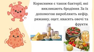 Корисними є також бактерії, які викликають бродіння. За їх допомогою виробляють кефір, ряжанку, оцет, квасять овочі та фрукти.