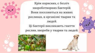 Крім корисних, є безліч хвороботворних бактерій. Вони поселяються на живих рослинах, в організмі тварин та людей. Ці бактерії викликають гниття рослин, хвороби у тварин та людей.