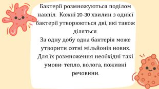 Бактерії розмножуються поділом навпіл. Кожні 20-30 хвилин з однієї бактерії утворюються дві, які також діляться. За одну добу одна бактерія може утворити сотні мільйонів нових. Для їх розмноження необхідні такі умови: тепло, волога, поживні речовини.