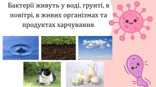 Бактерії живуть у воді, грунті, в повітрі, в живих організмах та продуктах харчування.
