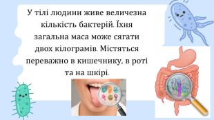 У тілі людини живе величезна кількість бактерій. Їхня загальна маса може сягати двох кілограмів. Містяться переважно в кишечнику, в роті та на шкірі.