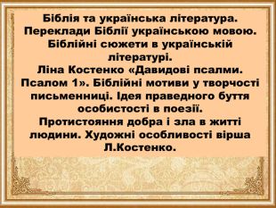 Біблія та українська література. Переклади Біблії українською мовою. Біблійні сюжети в українській літературі. Ліна Костенко «Давидові псалми. Псалом 1». Біблійні мотиви у творчості письменниці. Ідея праведного буття особистості в поезії. Протистояння добра і зла в житті людини. Художні особливості вірша Л. Костенко.