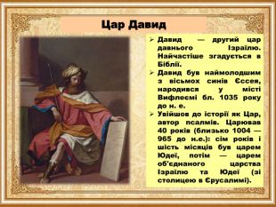 Цар Давид. Давид — другий цар давнього Ізраїлю. Найчастіше згадується в Біблії. Давид був наймолодшим з вісьмох синів Єссея, народився у місті Вифлеємі бл. 1035 року до н. е. Увійшов до історії як Цар, автор псалмів. Царював 40 років (близько 1004 — 965 до н.е.): сім років і шість місяців був царем Юдеї, потім — царем об'єднаного царства Ізраїлю та Юдеї (зі столицею в Єрусалимі).