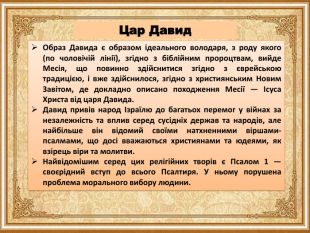 Використані джерелаhttps://zno.if.ua/?p=3770https://www.0532.ua/news/2491313/peresopnicke-evangelie-simvol-derzavnosti-so-mae-poltavski-storinki-istoriihttps://uk.wikipedia.org/wiki/%D0%9 F%D0%B5%D1%80%D0%B5%D1%81%D0%BE%D0%BF%D0%BD%D0%B8%D1%86%D1%8 C%D0%BA%D0%B5_%D0%84%D0%B2%D0%B0%D0%BD%D0%B3%D0%B5%D0%BB%D1%96%D1%94https://www.ukrlib.com.ua/books/printit.php?tid=26538https://uk.wikipedia.org/wiki/%D0%94%D0%B0%D0%B2%D0%B8%D0%B4https://znayshov.com/News/Details/dobirka_materialiv_dlia_provedennia_tematychnoho_uroku_do_dnia_narodzhennia_liny_kostenkohttps://litart.ru/pamyatnik-svyatomu-proroku-davidu-v-ierusalime/https://art-sculptor.com/ru/skulptura-david-mikelandzhelo-buonarroti-titan-epohi-vozrozhdeniya/https://lektorium.in.ua/idejno-hudozhnij-analiz-virsha-davidovi-psalmi-kostenko/