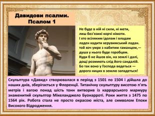 Давидови псалми. Псалом 1 Не буде в ній ні сили, ні мети,лиш без'язикі корчі німоти.І хто всіляким ідолам і владамладен кадити херувимський ладан.той хоч умре з набитим гаманцем,—душа у нього буде горобцем. Куди б не йшов він, на землі і далі,дощі розмиють слід його сандалій. Бо так воно у Господа ведеться —дорога ницих в землю западеться!Скульптура «Давид» створювалася в період з 1501 по 1504 і дійшла до наших днів, зберігається у Флоренції. Титанічну скульптуру висотою п'ять метрів і вагою понад шість тонн витворив із каррарського мармуру знаменитий скульптор Мікеланджело Буонарроті. Роки життя з 1475 по 1564 рік. Робота стала не просто окрасою міста, але символом Епохи Високого Відродження.