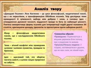 «Давидові Псалми» Ліни Костенко – це цикл філософської, медитативної поезії, що є не переспівом, а трансформацією біблійних псалмів. Твір досліджує теми праведності й гріховності, вибору між добром і злом, а головна ідея – утвердження духовної чесності, відданості правді та Богу як найвищої цінності. Поетеса використовує форму псалмів для інтерпретації подій другої половини XX століття, критикуючи цензуру, ідеологію та протестуючи проти заборони релігії. Аналіз твору Жанр – філософська медитативна поезія, що є наслідуванням біблійного псалма. Символіка образів: Праведник: Порівнюється з міцним деревом біля потоку, яке є родючим та живим. Грішник/Низька людина: З «сірою, напівмертвою» душею, що не має сили, як німий корч. Тема – вічний конфлікт між праведним шляхом і шляхом лукавства, правдою та брехнею. Ідея – щасливий той, хто зберігає чистоту совісті, а шляхи ницих приречені на забуття.