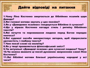 Дайте відповіді на питання. Чому Ліна Костенко звертається до біблійних псалмів царя Давида?Які головні мотиви звучать у цих поезіях?Як у «Давидових псалмах» поєднується біблійне й сучасне?Що у віршах Костенко нагадує стиль і ритміку біблійних текстів?Які почуття та переживання людини перед Богом передає поетеса?Які художні засоби використовує авторка, щоб підкреслити урочистість і глибину тексту?Чим поезії схожі на молитву?Як у творі проявляється філософський зміст?Чи актуальні «Давидові псалми» для сучасної людини? Чому?Чи можна вважати ці поезії духовним зверненням самої Ліни Костенко?Які біблійні мотиви близькі українському народові у всі часи?