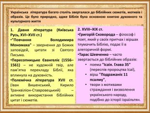 Українська література багато століть зверталася до біблійних сюжетів, мотивів і образів. Це було природно, адже Біблія була основною книгою духовного та культурного життя1. Давня література (Київська Русь, XVI–XVII ст.)"Повчання Володимира Мономаха" – звернення до Божих заповідей, цитати зі Святого Письма. Пересопницьке Євангеліє (1556–1561) – не художній твір, але пам’ятка перекладу Біблії, яка вплинула на духовність. Полемічна література XVII ст. (Іван Вишенський, Кирило Транквіліон-Ставровецький) – активне використання біблійних цитат і сюжетів.2. XVIII–XIX ст. Григорій Сковорода – філософ і поет, який у своїх притчах і віршах тлумачить Біблію, подає її в алегоричній формі. Тарас Шевченко – часто звертається до біблійних образів:поема "Ісаія. Глава 35" (переспів пророцтва Ісаї),вірш "Подражаніє 11 псалму",твори з мотивами страждання і визволення українського народу, подібно до історії ізраїльтян.