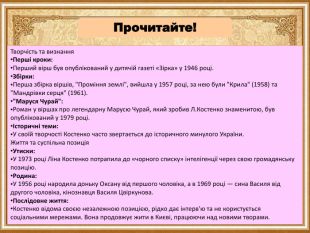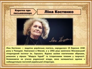 Коротко про письменницю. Ліна Костенко. Ліна Костенко — видатна українська поетеса, народилася 19 березня 1930 року в Ржищеві. Навчалася в Москві, а у 1956 році закінчила Московський літературний інститут ім. Горького. Відома своїми поетичними збірками, романом у віршах "Маруся Чурай" та історичними темами у творчості. Незважаючи на утиски радянської влади, вона залишається однією з найвидатніших постатей української літератури.