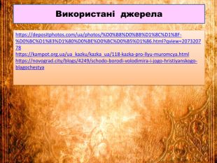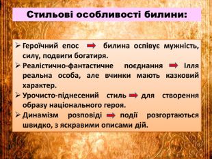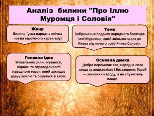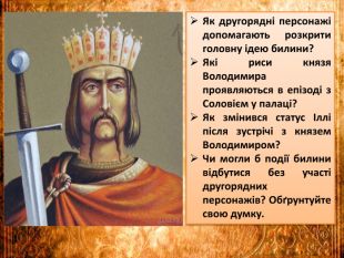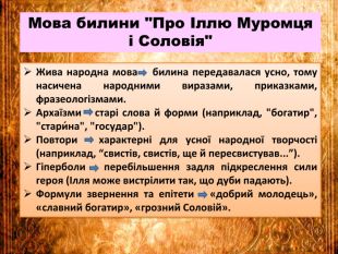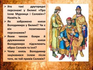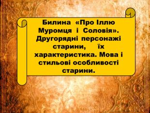 Презентація «Билина «Про Іллю Муромця і Соловія». Другорядні персонажі старини, їх характеристика. Мова і стильові особливості старини» створена до підручника української літератури 8 класу НУШ О.Авраменка. Робота містить запитання на повторення, характеристики другорядних героїв, аналіз, ілюстративний матеріал, тестові завдання. Презентація допоможе вчителю у підготовці до уроку.
