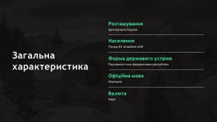 Загальна характеристика. Розташування. Центральна Європа. Населення. Понад 83 мільйони осіб. Форма державого устрою. Парламентська федеративна республіка. Офіційна мова. Німецька. ВалютаЄвро