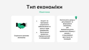 Тип економіки. Німеччина. Значна роль уряду у регулюванні та формуванні економіки,але вирішальна рольприватного бізнесу і ринків у стимулюванні зростання та інновацій. Акцент на програмах соціального забезпечення та захисті прав працівників. Заохочення приватних підприємництв та конкуренції. Соціально-ринкова економіка