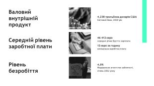 4,238 трильйона доларів СШАСвітовий банк, 2020 рік46 412 євросередня річна брутто-зарплата12 євро за годинумінімальна заробітна плата4,0%Федеральне агентство зайнятості, січень 2022 року. Валовий внутрішній продукт. Середній рівень заробтної плати. Рівень безробіття