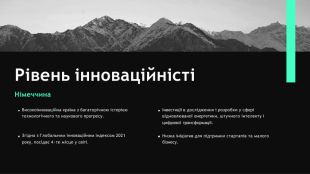 Рівень інноваційністіНімеччина. Високоінноваційна країна з багаторічною історією технологічного та наукового прогресу. Згідно з Глобальним інноваційним індексом 2021 року, посідає 4-те місце у світі.Інвестиції в дослідження і розробки у сфері відновлюваної енергетики, штучного інтелекту і цифрової трансформації. Низка ініціатив для підтримки стартапів та малого бізнесу.